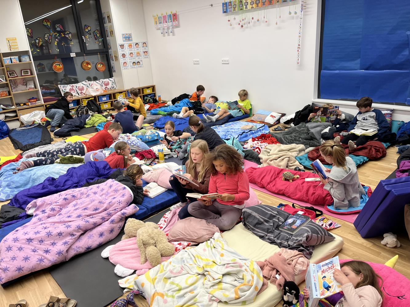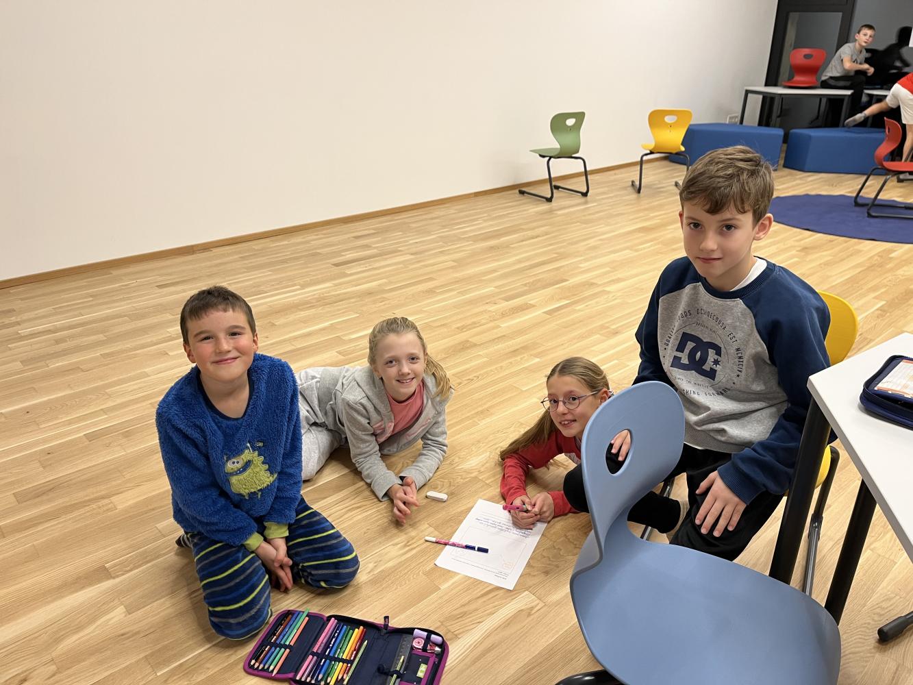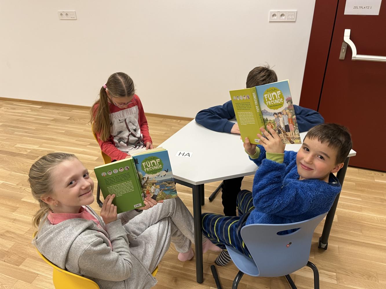 Die Kinder der 4a hatten die große Ehre als erste Klasse in der neuen Schule zu übernachten. In Vierergruppen erledigten sie spannende Arbeitsaufträge rund um das Thema „Fünf Freunde“. Im Anschluss daran durfte dann natürlich auch eine Belohnung nicht fehlen, und zwar der passende Film dazu – „Fünf Freunde – Die Sache mit der Schatzinsel (aus dem Jahr 1957 in schwarz-weiß). Wider Erwarten der Lehrpersonen schafften es alle Kinder während des Filmes wach zu bleiben und so konnte im Anschluss noch fleißig gelesen werden. Einige tapfere Nachteulen schafften dies sogar bis spät in die Nacht hinein.