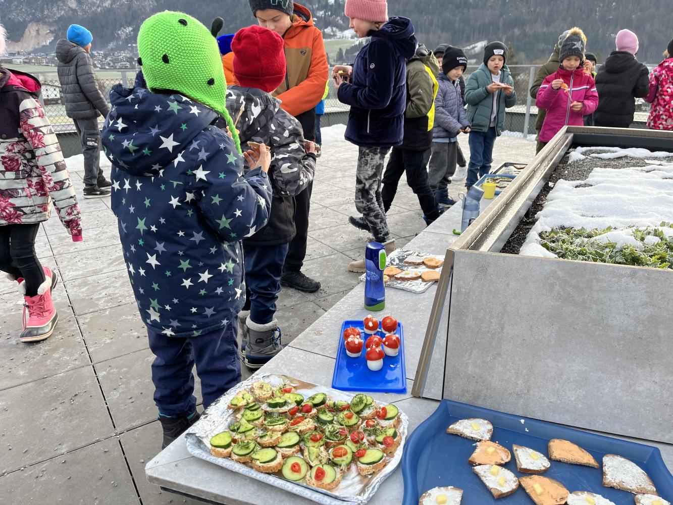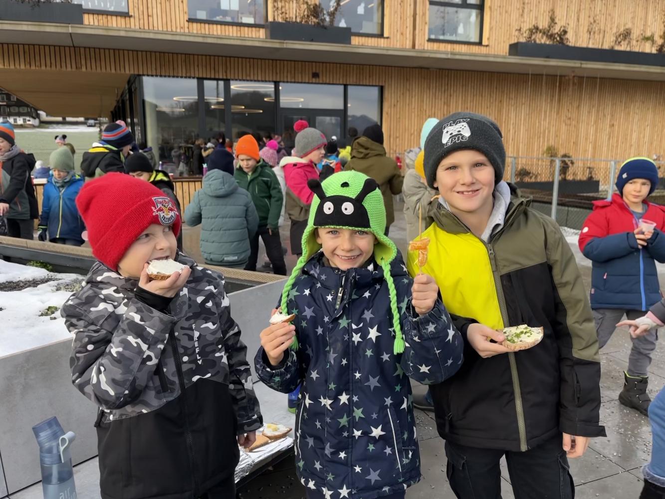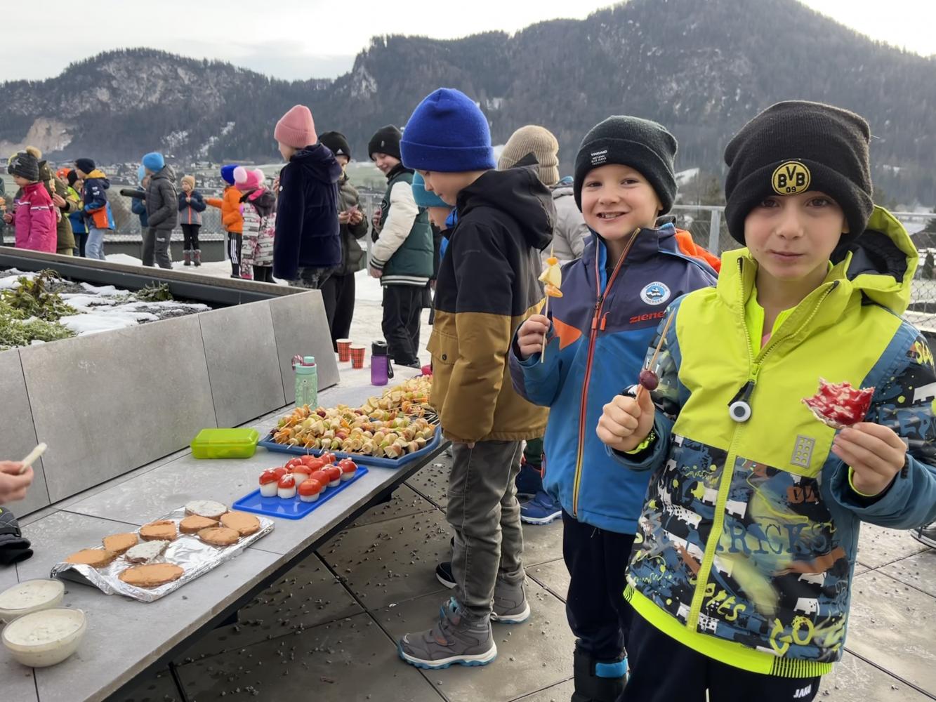 Auch heuer führten wir in der letzten Woche vor den Weihnachtsferien unseren traditionellen Weihnachtsbrunch durch. Jede Klasse bereitete dafür in den ersten beiden Stunden eine gesunde Jause vor, die dann in der großen Pause verspeist werden konnte. Von Broten mit unterschiedlichen Aufstrichen, über Obstspieße, Kinderpunsch und die begehrten „Fliegenpilze“ war alles dabei, um sich für den restlichen Schultag stärken zu können.