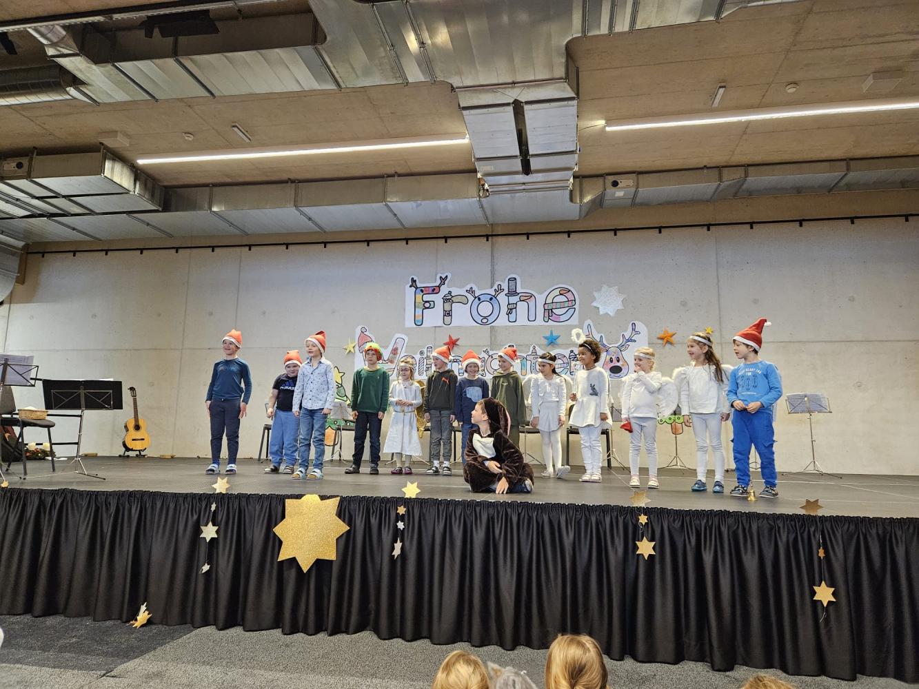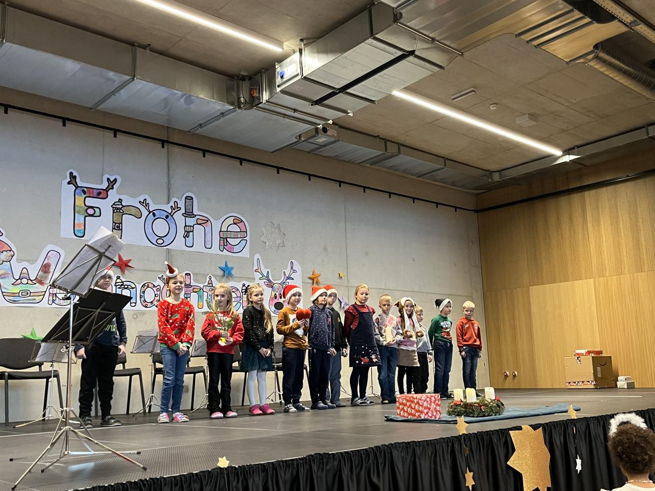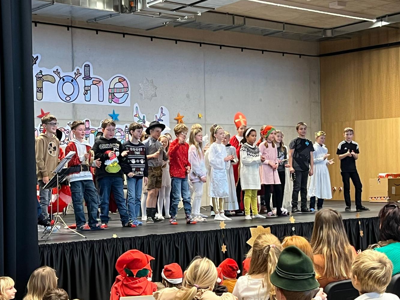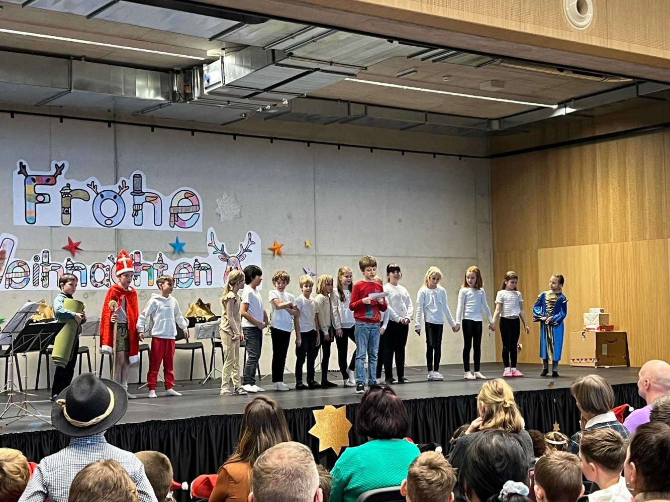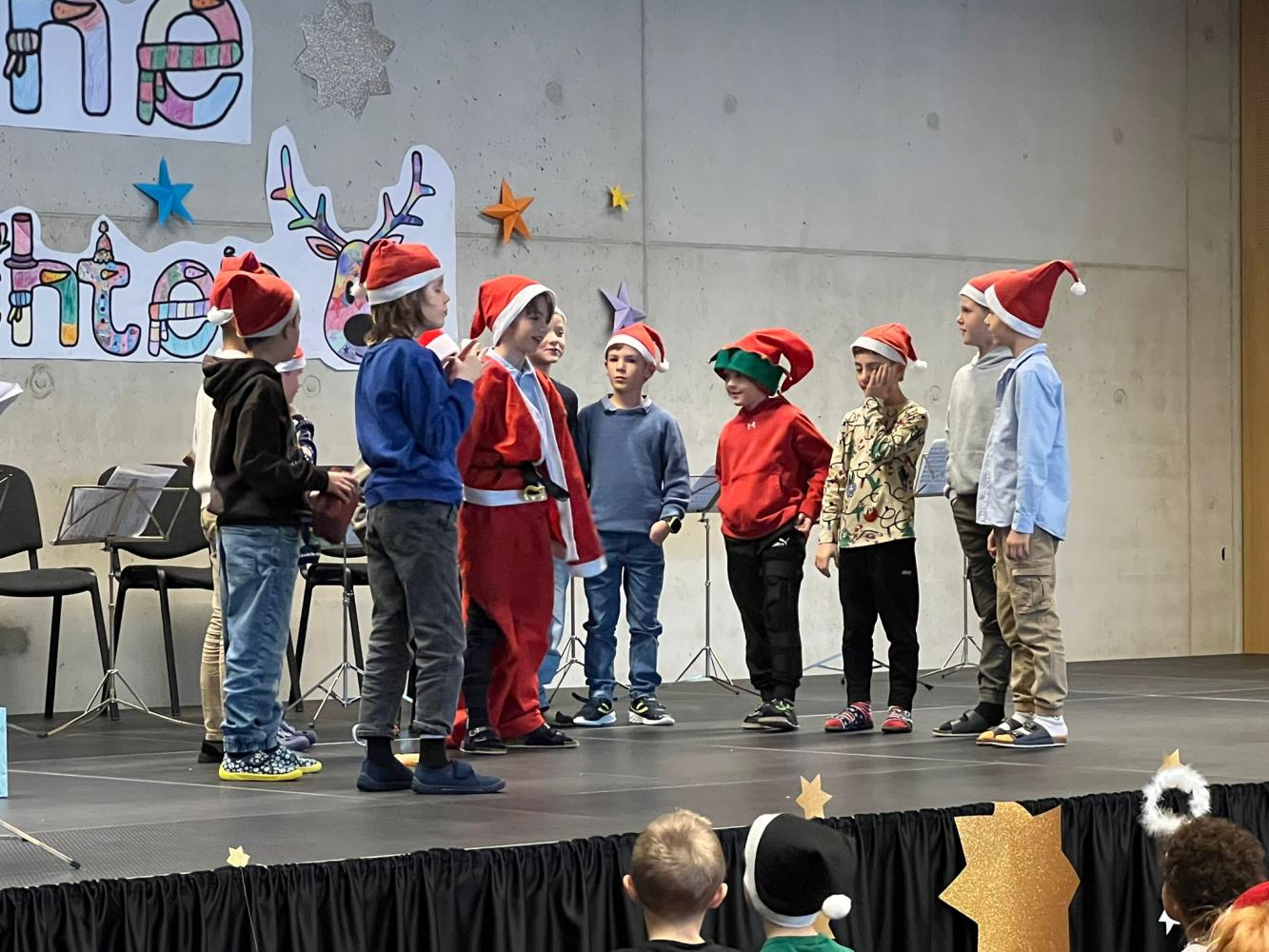 Auch dieses Jahr durften die Kinder wieder ihre Schauspielkünste unter Beweis stellen und konnten vor ihren Familien, erstmals auf der neuen Bühne unseres Bildungszentrums, verschiedenste Stücke vortragen. Beispielsweise wurde uns gezeigt, wie Yoga im Himmel funktioniert; wie ein Osterhase an Weihnachten zu Besuch kommt oder wie das Christkind und der Weihnachtsmann einen Streit lösen. Alle haben ihre Aufführungen bravourös gemeistert, worauf sie sehr stolz sein können. Eine gelungene Weihnachtsfeier!