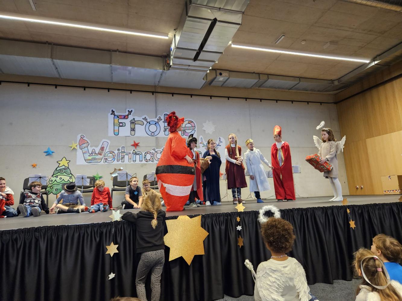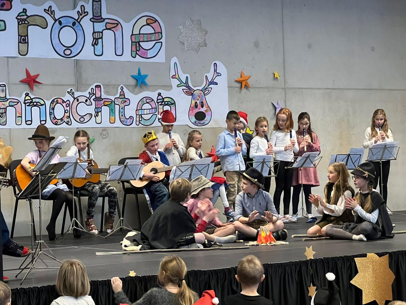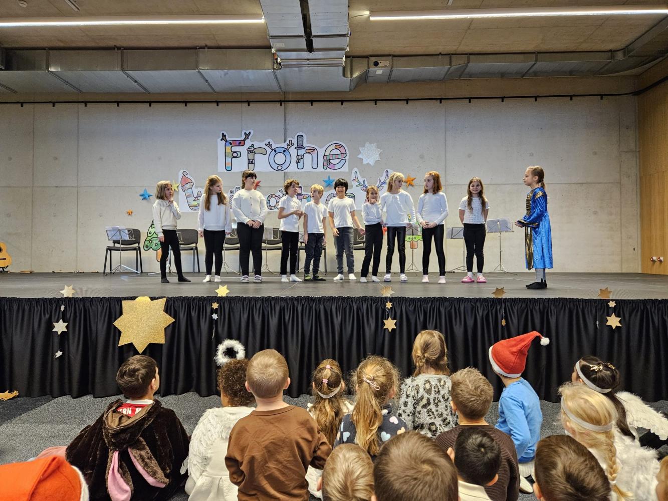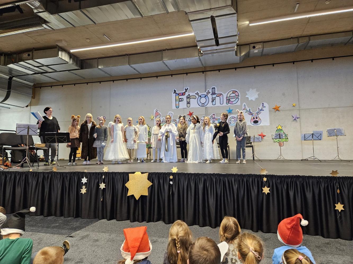 Auch dieses Jahr durften die Kinder wieder ihre Schauspielkünste unter Beweis stellen und konnten vor ihren Familien, erstmals auf der neuen Bühne unseres Bildungszentrums, verschiedenste Stücke vortragen. Beispielsweise wurde uns gezeigt, wie Yoga im Himmel funktioniert; wie ein Osterhase an Weihnachten zu Besuch kommt oder wie das Christkind und der Weihnachtsmann einen Streit lösen. Alle haben ihre Aufführungen bravourös gemeistert, worauf sie sehr stolz sein können. Eine gelungene Weihnachtsfeier!